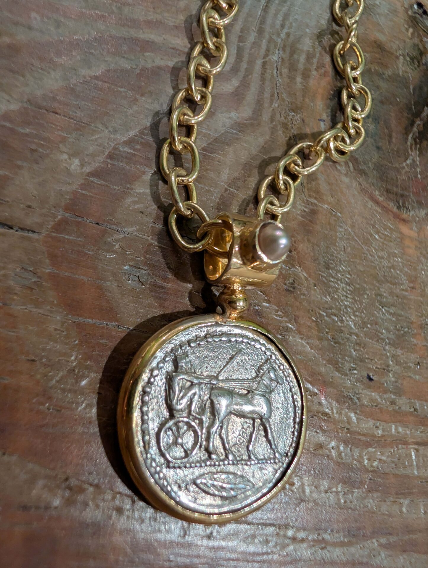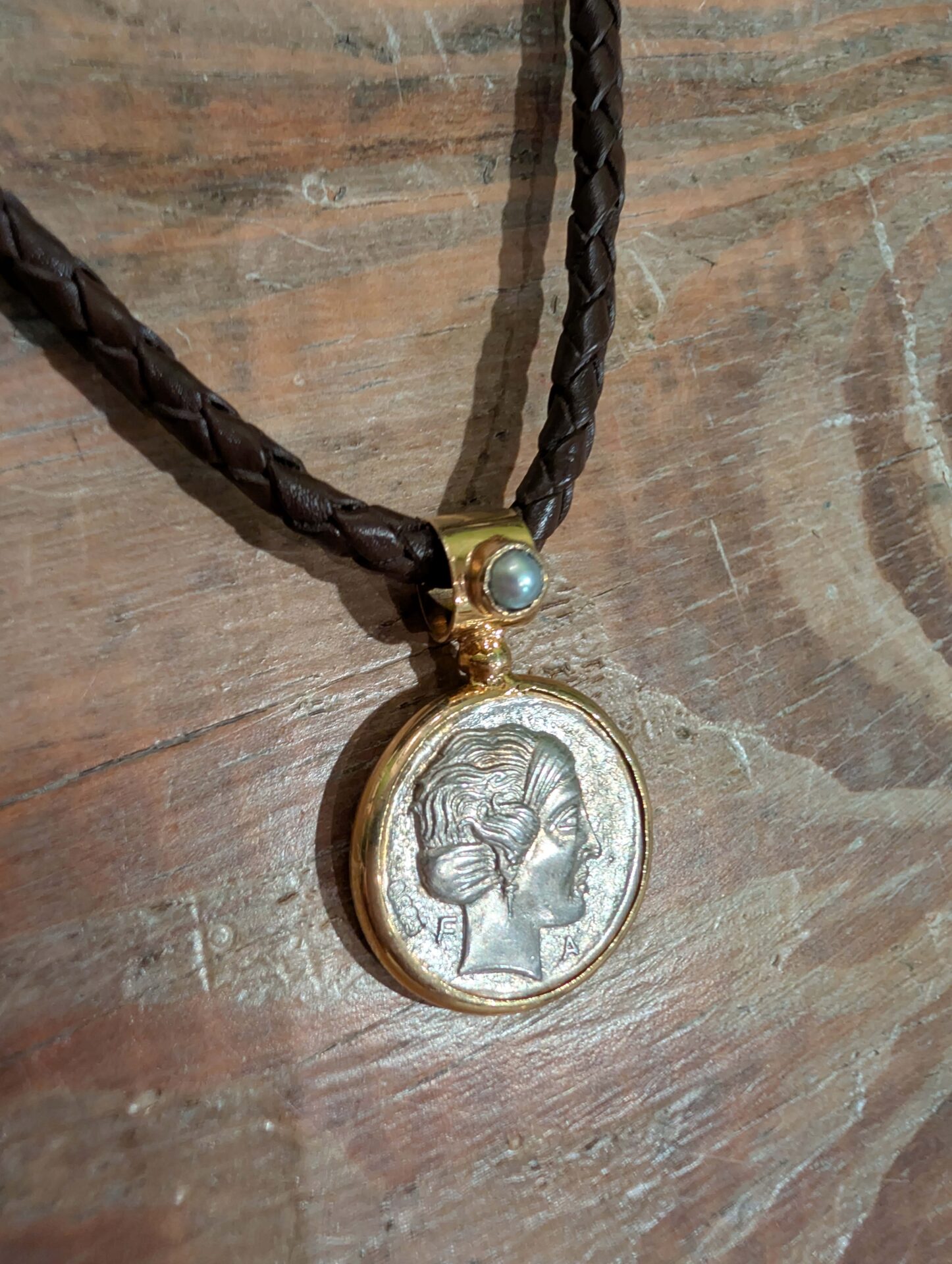 Either on a Gold Filled Chain or adjustable Leather strap, these Greek Coins have been cast in Sterling and appointed with a Pearl in the bale